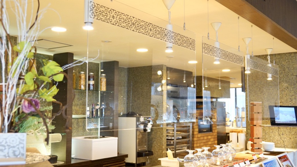 飛沫防止策として、随所にパーテーションを設置しました。アイヌ文様をあしらったデザインも"鶴雅ならでは”と好評です。