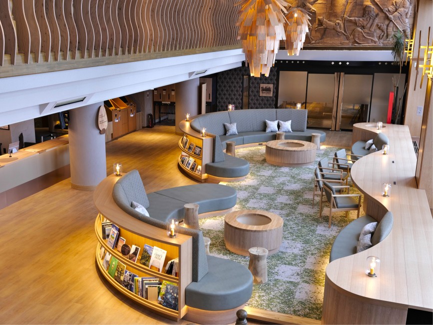 ロビーには靴を脱いでお寛ぎいただけるスペースや北海道の文化・観光について調べられる図書スペース、リラックスできるオーディオコーナーを新設いたしました。